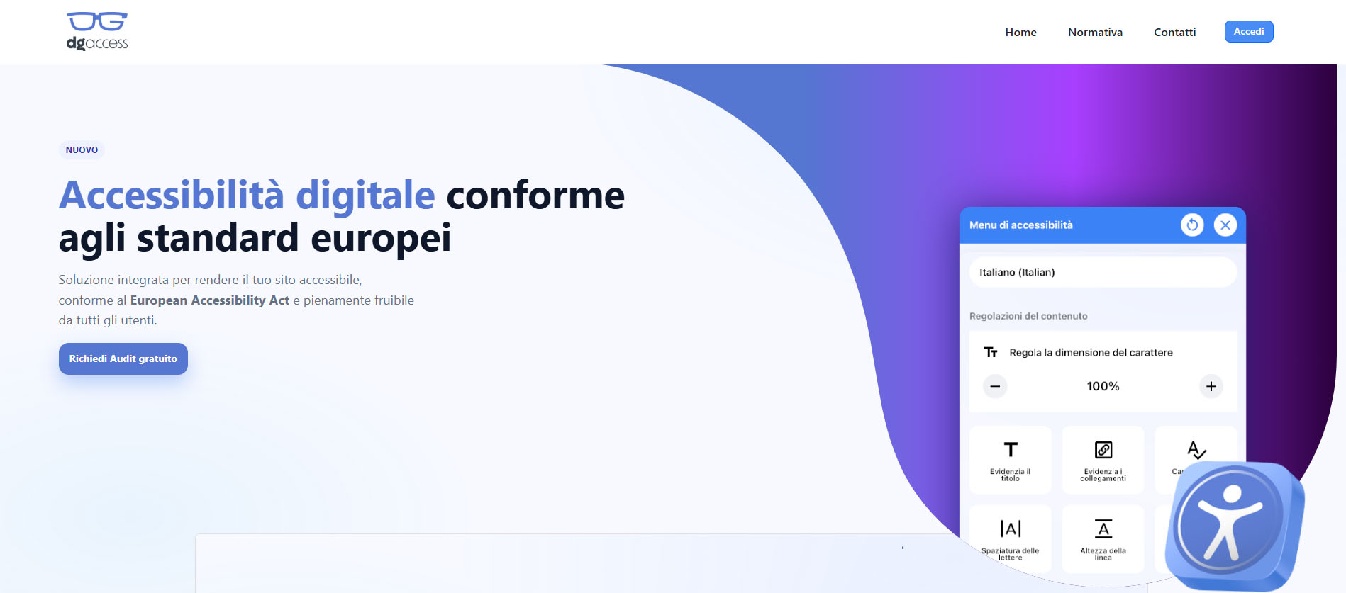 Con il servizio DGAccess si vuole offrire un servizio integrato di accessibilità digitale conforme agli standard europei, in particolare al nuovo European Accessibility Act (Direttiva UE 2019/882), obbligatorio a partire dal 28 giugno 2025. Questo servizio permette di rendere siti web e servizi digitali pienamente accessibili e fruibili per tutti gli utenti, inclusi quelli con disabilità, evitando così rischi legali, danni reputazionali ed esclusione di una parte importante del pubblico.