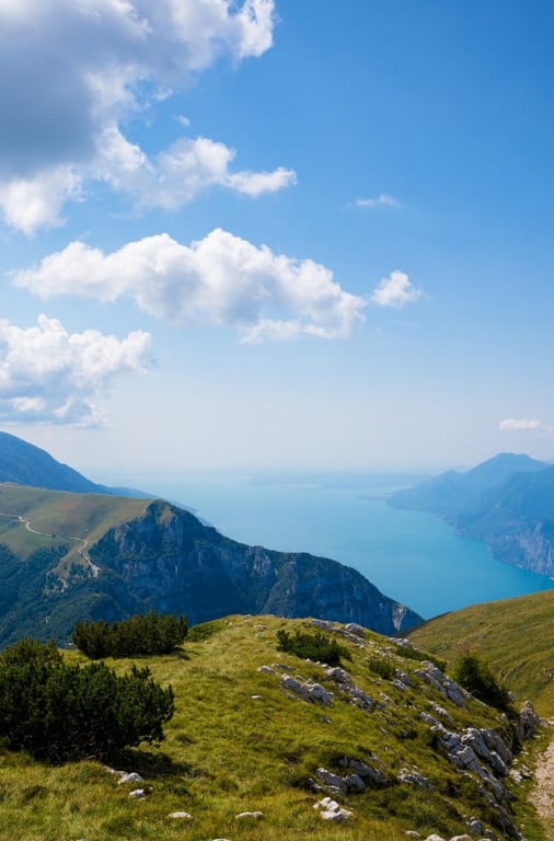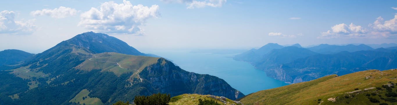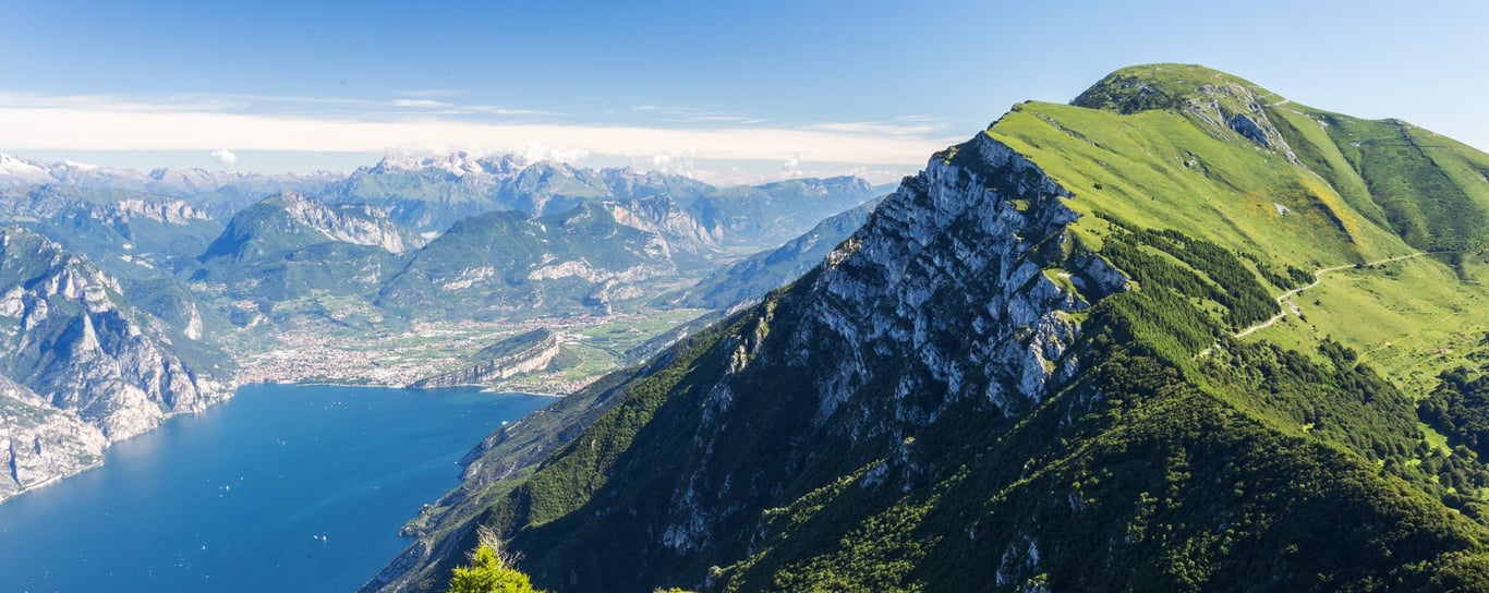 Mount Baldo, 2218 m, holder vagt over søen og byder på en fortryllende udsigt og vandreture langs stier, der er skåret ud gennem århundrederne, hvor besøgende kan beundre sjældne blomsterarter, der blomstrer året rundt.Det markante store bjerg Monte Baldo dominerer landskabet og stiger op på den østlige side af søen fra San Vigilio til Torbole: kraftig, høj, udstrakt og isoleret, tårner den over hele søen, synlig fra alle steder.